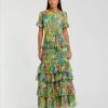 An a-line midi dress with a high neckline, 3/4 sleeves, and tiered ruffles for a graceful, modern silhouette. Perfect for garden parties, brunches, and daytime events.