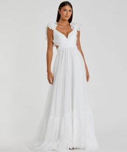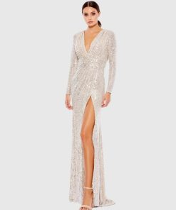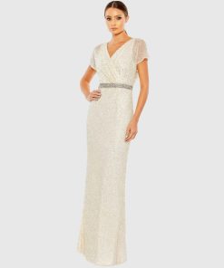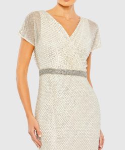 Mac Duggal Women’s Wedding White Sequined Drop Shoulder Faux Wrap Gown – Final Sale | White