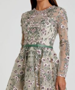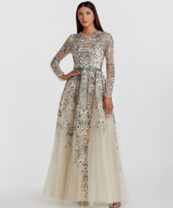 Mac Duggal Women’s Wedding Ivory Long Sleeve Floral Embellished A-line Gown | Sage Multi