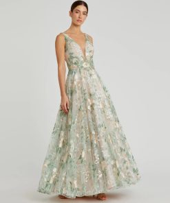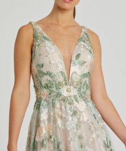 Mac Duggal Women’s Wedding Multicolor Floral Embroidered Illusion V-neck Gown | Cream Multi