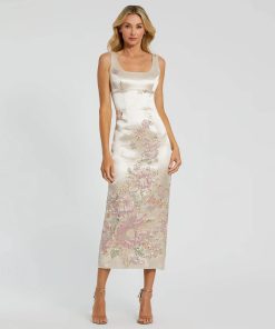 Mac Duggal Women’s Wedding Slim Strap Scoop Neck Bustier Brocade Midi Dress | Champagne Multi