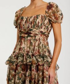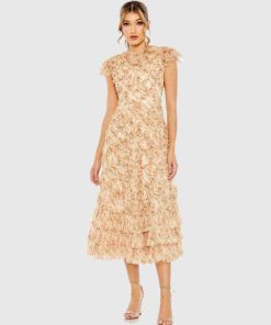 Mac Duggal Women’s Dresses Beige Ruffle Tiered Short Sleeve A Line Dress | Beige Multi