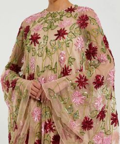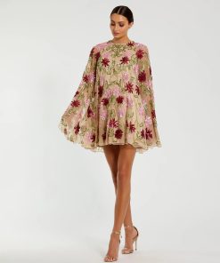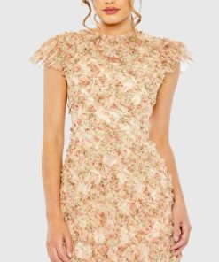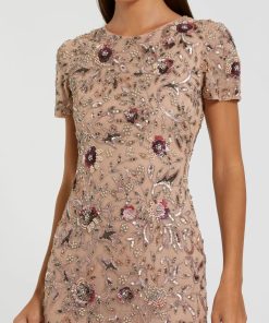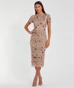 Mac Duggal Women’s Dresses Beige Floral Embellished Short Sleeve Midi Dress | Mocha