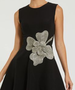 Mac Duggal Women’s Dresses Black Crepe Sleeveless Mini Dress With Rhinestone Flower | Black