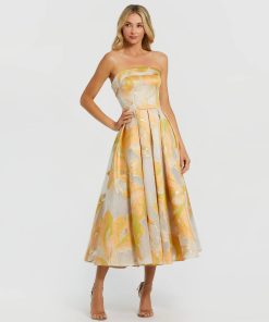 Mac Duggal Women’s Dresses Beige And Orange Strapless Brocade Midi Dress With Pockets | Peach Multi