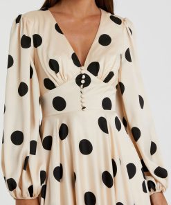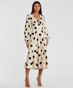 Mac Duggal Women’s Dresses Beige Polka Dot Charmeuse Long Sleeve V Neck Midi Dress | Beige