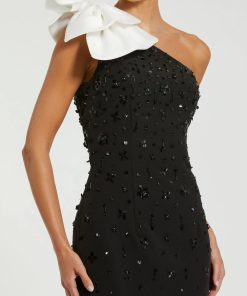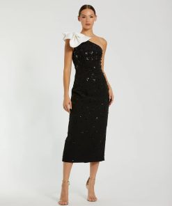 Mac Duggal Women’s Dresses Black Crepe One Shoulder Beaded Midi Dress With Bow | Black