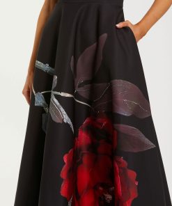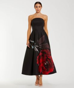 Mac Duggal Women’s Dresses Black Crepe Printed Strapless Midi Dress With Pockets | Black