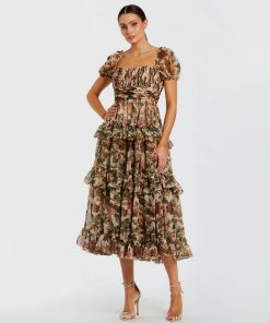Mac Duggal Women’s Dresses Beige Chiffon Ruffle A Line Midi Dress With Puff Sleeves | Cream Multi