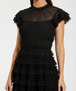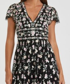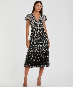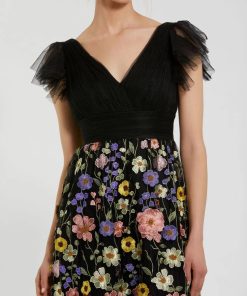 Mac Duggal Women’s Dresses Black Multicolor Embroidered Flutter Sleeve Floral Dress | Black Multi