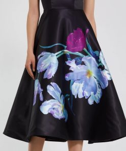 Mac Duggal Women’s Dresses Black Satin Cap Sleeve Midi Dress With Floral Print | Black
