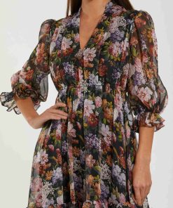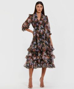 Mac Duggal Women’s Dresses Black Floral Chiffon Ruffle Midi Dress With 3/4 Sleeves | Black Multi