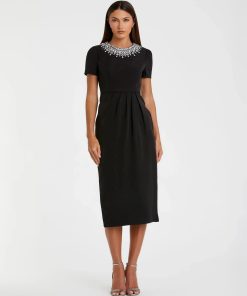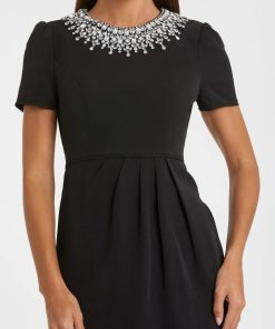 Mac Duggal Women’s Dresses Black Short Sleeve Rhinestone Neckline Sheath Dress | Black