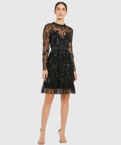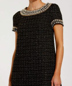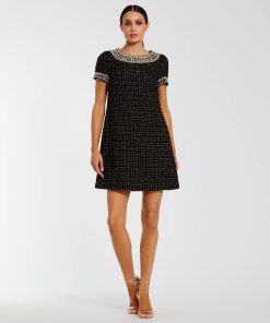 Mac Duggal Women’s Dresses Black Short Sleeve Embellished Boucle Mini Dress | Black