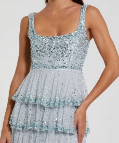 Mac Duggal Women’s Dresses Blue Embellished Net Tiered Ruffle Scoop Neck Dress | Powder Blue