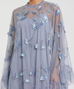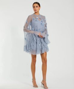 Mac Duggal Women’s Dresses Blue Embellished Long Sleeve Trapeze Dress With Ruffle Hem | Powder Blue