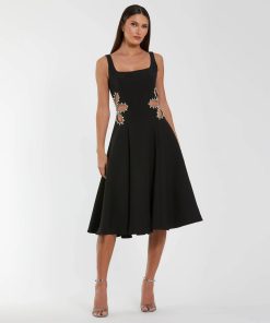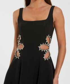Mac Duggal Women’s Dresses Black Sleeveless Crepe Rhinestone Cutout Midi Dress | Black