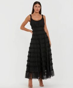 Mac Duggal Women’s Dresses Black Sleeveless Lace A Line Midi Dress With Ruffles | Black
