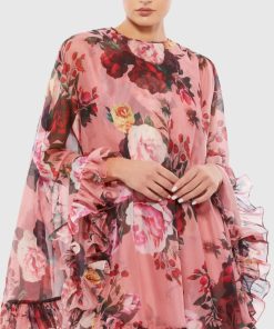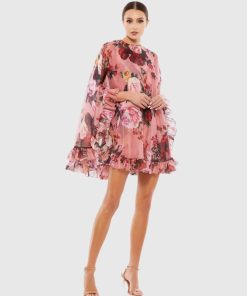 Mac Duggal Women’s Dresses Pink Multicolor Floral Print High Neck Ruffle Hem Cape Mini Dress | Pink