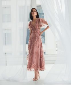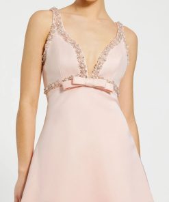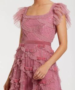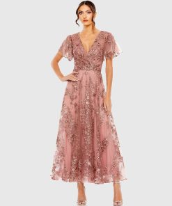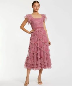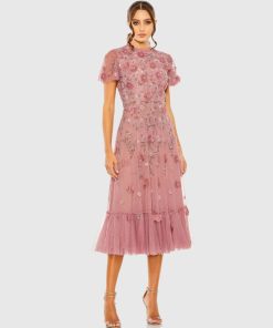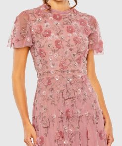 Mac Duggal Women’s Dresses Pink Embellished High Neck Flutter Sleeve A Line Dress | Berry