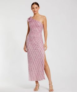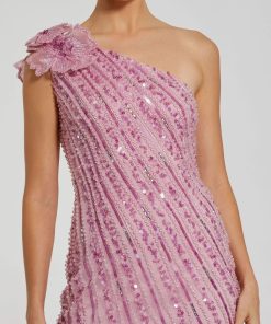 Mac Duggal Women’s Dresses Pink One Shoulder Beaded Mesh Dress With Flower | Orchid