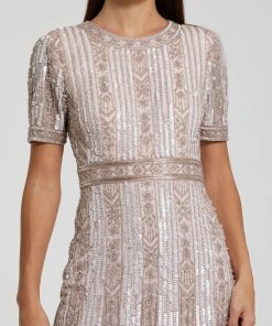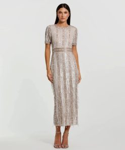 Mac Duggal Women’s Dresses Pink High Neck Short Sleeve Crystal Fringe Sheath Dress | Blush