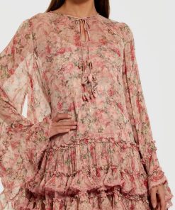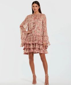 Mac Duggal Women’s Dresses Pink Long Sleeve Lace Up Front Tiered Ruffle Dress | Rose Multi