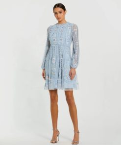 Mac Duggal Women’s Dresses Blue Floral Mesh Long Sleeve Micro Ruffle Mini Dress | Blue