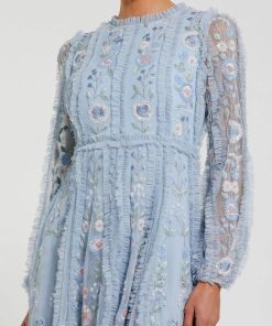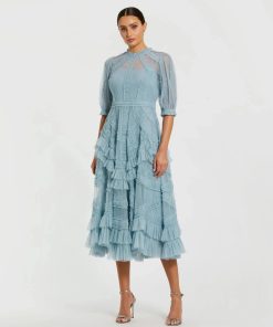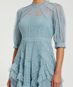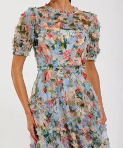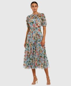 Mac Duggal Women’s Dresses Blue Floral Mesh Ruffle High Neck Midi Dress | Blue Multi