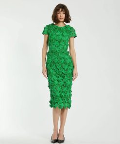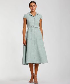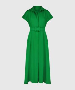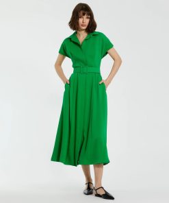 Mac Duggal Women’s Dresses Green Crepe Collared Short Sleeve Midi Dress With Belt | Green