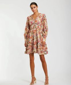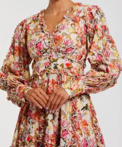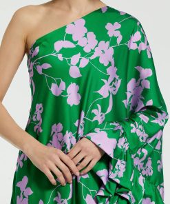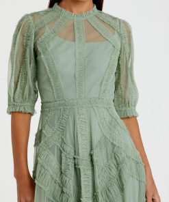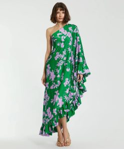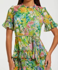 Mac Duggal Women’s Dresses Green High Neck Ruffle Cap Sleeve Floral Dress | Green Multi
