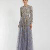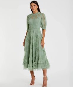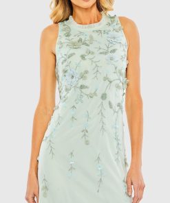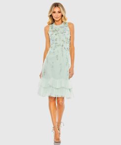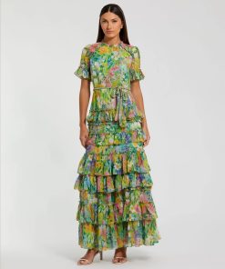 Mac Duggal Women’s Dresses Green Embellished Ruffle Tiered High Neck Floral Dress | Seafoam