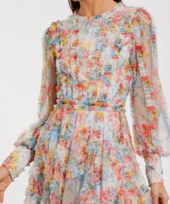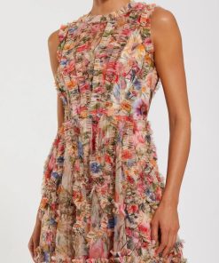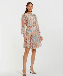Mac Duggal Women’s Dresses Multicolor Micro Ruffle High Neck A-line Mini Dress | Cream Multi