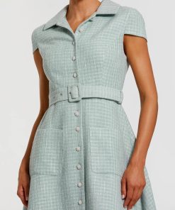 Mac Duggal Women’s Dresses Light Blue Boucle Cap Sleeve Button Up Midi Dress | Xs|s|m|l