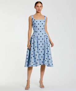 Mac Duggal Women’s Dresses Blue Square Neck Crepe Polka Dot Fit And Flare Midi Dress | Sky Multi