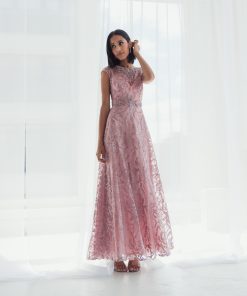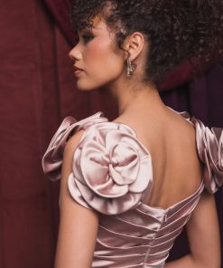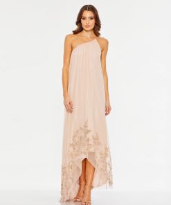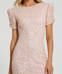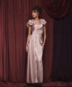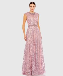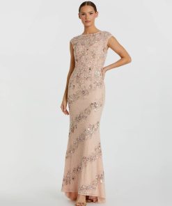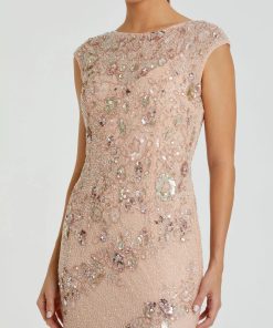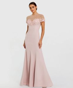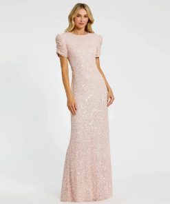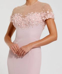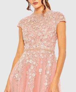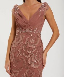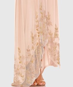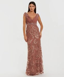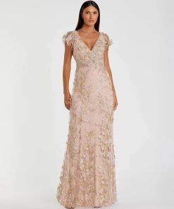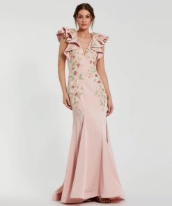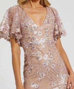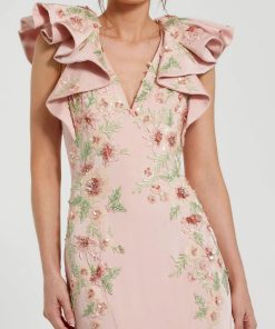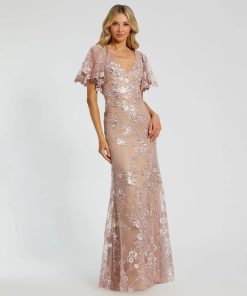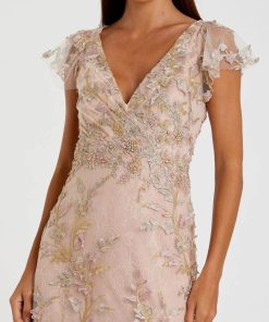 Mac Duggal Women’s Dresses Pink Embroidered Applique Wrap Over Flutter Sleeve Gown | Rose Gold