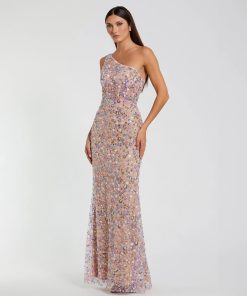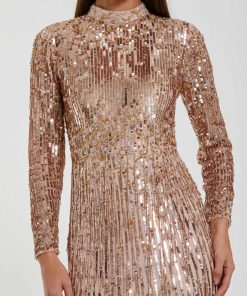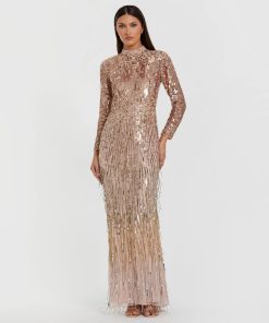 Mac Duggal Women’s Dresses Pink Long Sleeve Fringe Embellished Column Gown | Gold Silver Ombre