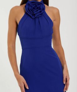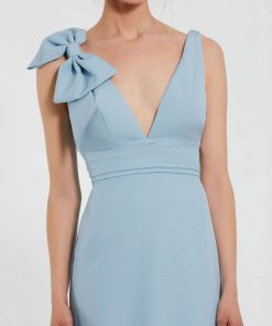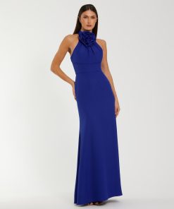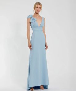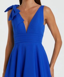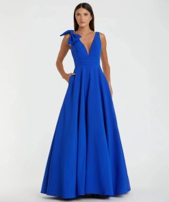 Mac Duggal Women’s Dresses Blue Sleeveless Plunge Neck Crepe Ballgown With Bow Detail | Cobalt