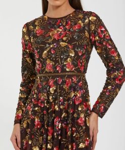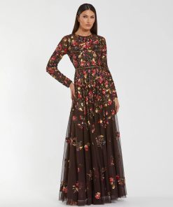 Mac Duggal Women’s Dresses Brown Long Sleeve Floral Embellished Evening Gown | Espresso Multi
