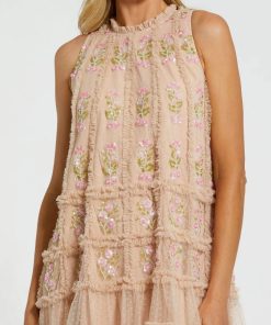 Mac Duggal Women’s Dresses Beige Sleeveless High Neck Beaded Ruffle Mini Dress | Beige