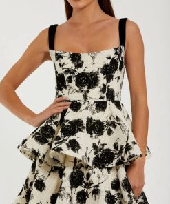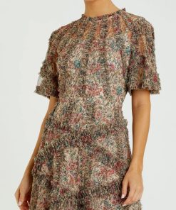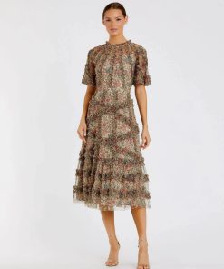Mac Duggal Women’s Dresses Beige Illusion Floral Midi Dress With Ruffle Detailing | Beige Multi