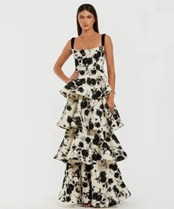 Mac Duggal Women’s Dresses Beige Ruffle Tiered Short Sleeve A Line Dress | Beige Multi