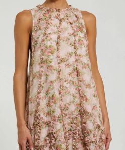 Mac Duggal Women’s Dresses Pink Sleeveless Floral Chiffon Micro Ruffle Midi Dress | Pink Multi