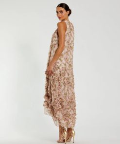 Mac Duggal Women’s Dresses Pink Sleeveless V-neck Floral Chiffon Ruffle Ball Gown | Pink Multi