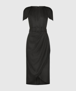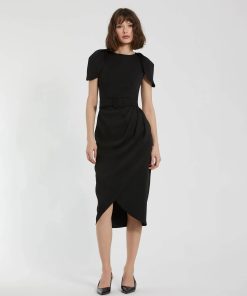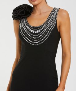 Mac Duggal Women’s Dresses Black Crepe One Shoulder Beaded Midi Dress With Bow | Black