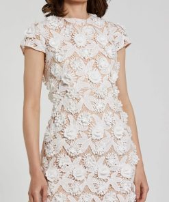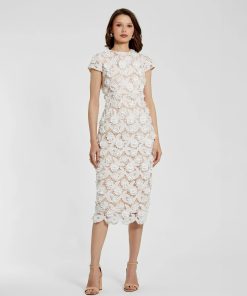 Mac Duggal Women’s Dresses White And Beige Floral Lace Fitted Short Sleeve Midi Dress