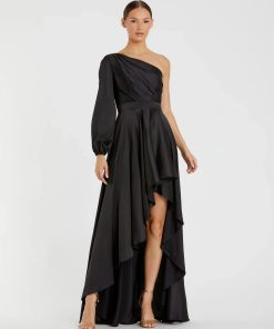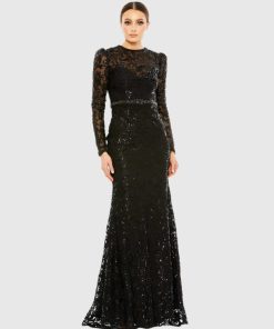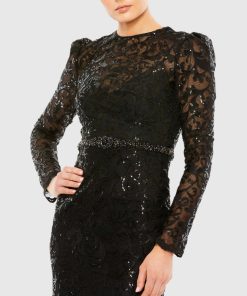 Mac Duggal Women’s Wedding Black Long Sleeve Floral Brocade Ball Gown | Black