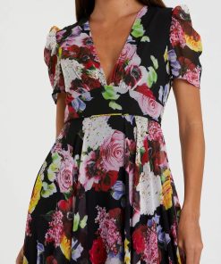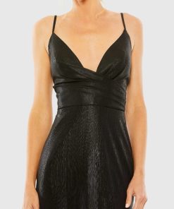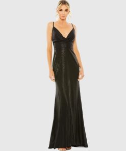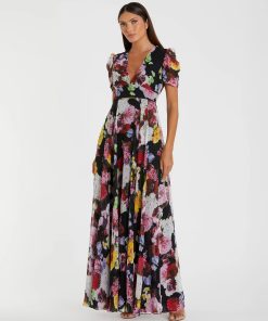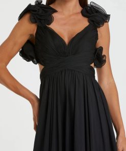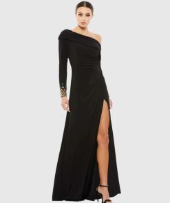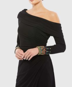 Mac Duggal Women’s Wedding Black Multicolor Beaded Cuff Drop Shoulder Faux Wrap Gown | Black Multi