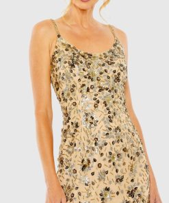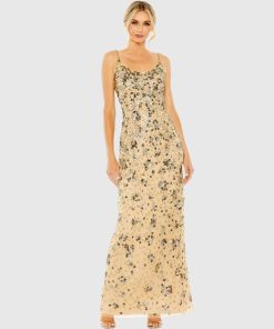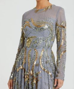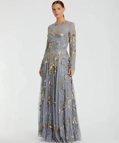 Mac Duggal Women’s Wedding Blue And Gold Long Sleeve Embellished Illusion Evening Gown | Blue