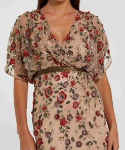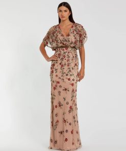 Mac Duggal Women’s Wedding Beige Wrap Over Bishop Sleeve Gown With Pearl Beading | Ivory Nude